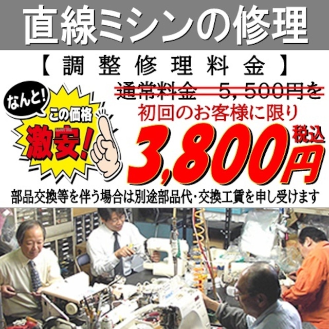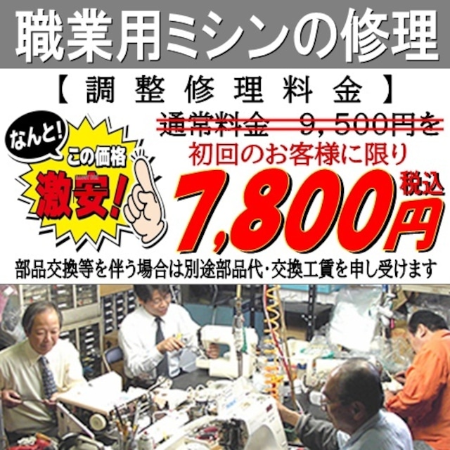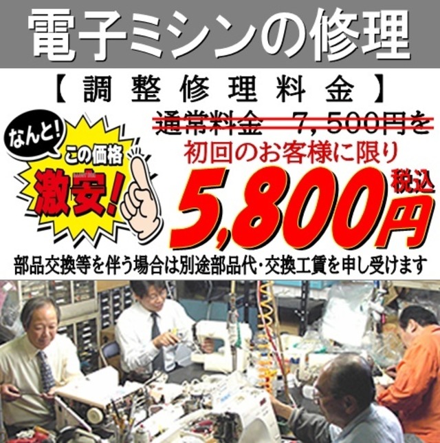 ┏★☆★☆━━━━━━━━━━━━━━━┓ あ な た の ミ シ ン の 修 理 屋 さ ん で す ┗━━━━━━━━━━━━━━━☆★☆★┛ 【 ミ シ ン 修 理 技 術 料 金 】 調整修理 ( 出張費込 ) ⇒ 7,500円 (税込) を ▼ \ 初回 お客様に限り ⇒ 5,800円 (税込) / ※注) 部品交換を伴う場合は別途申し受けます。 ※注) 分解は修理スタッフにお尋ねください。 ※注) 修理不可能な場合は料金は頂きません。 _/_/_/_/_/_/_/_/_/_/_/_/_/_/_/ 調整修理は部品交換を伴わない修理で分解や 外装カバーの取外しを行わない簡易修理です。 ご指定のご住所へ地域担当の修理スタッフが、 迅速にお伺いして親切丁寧に調整いたします。 作業時間は最短で約30分で終了いたします。 ※注) 重度の場合はお預かり修理となります。 +++★ 早くて、安くて、安心、便利です ★+++ ◎ 部品交換などが必要な場合は、お見積りを いたしますので、ご検討された上で 部品交換を行いますのでご安心ください。 ◎ オーバーホールも別途承りますので、 詳しくは修理スタッフにお尋ねください。 _/_/_/_/_/_/_/_/_/_/_/_/_/_/_/ .
