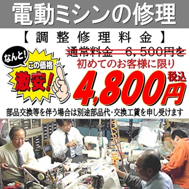 ┏★☆★☆━━━━━━━━━━━━━━━┓ あ な た の ミ シ ン の 修 理 屋 さ ん で す ┗━━━━━━━━━━━━━━━☆★☆★┛ 【 ミ シ ン 修 理 技 術 料 金 】 調整修理 ( 出張費込 ) ⇒ 6,500円 (税込) を ▼ \ 初回 お客様に限り ⇒ 4,800円 (税込) / ※注) 部品交換を伴う場合は別途申し受けます。 ※注) 分解は修理スタッフにお尋ねください。 ※注) 修理不可能な場合は料金は頂きません。 _/_/_/_/_/_/_/_/_/_/_/_/_/_/_/ 調整修理は部品交換を伴わない修理で分解や 外装カバーの取外しを行わない簡易修理です。 ご指定のご住所へ地域担当の修理スタッフが、 迅速にお伺いして親切丁寧に調整いたします。 作業時間は約30~40分で終了いたします。 ※注) 重度の場合はお預かり修理となります。 +++★ 早くて、安くて、安心、便利です ★+++ ◎ 部品交換などが必要な場合は、お見積りを いたしますので、ご検討された上で 部品交換を行いますのでご安心ください。 ◎ オーバーホールも別途承りますので、 詳しくは修理スタッフにお尋ねください。 _/_/_/_/_/_/_/_/_/_/_/_/_/_/_/ .